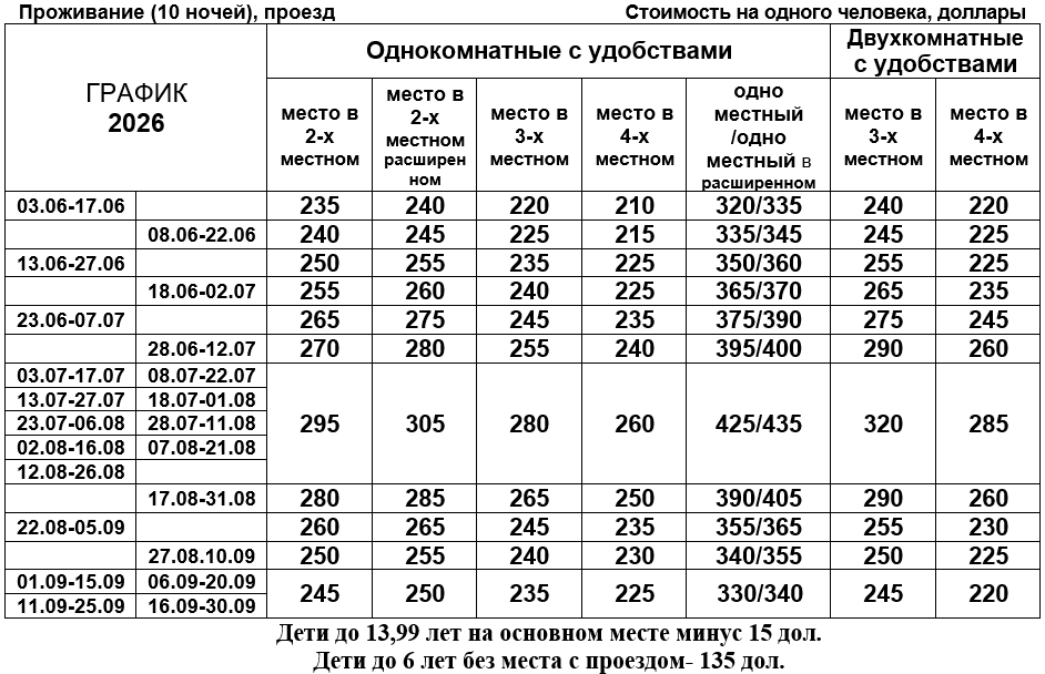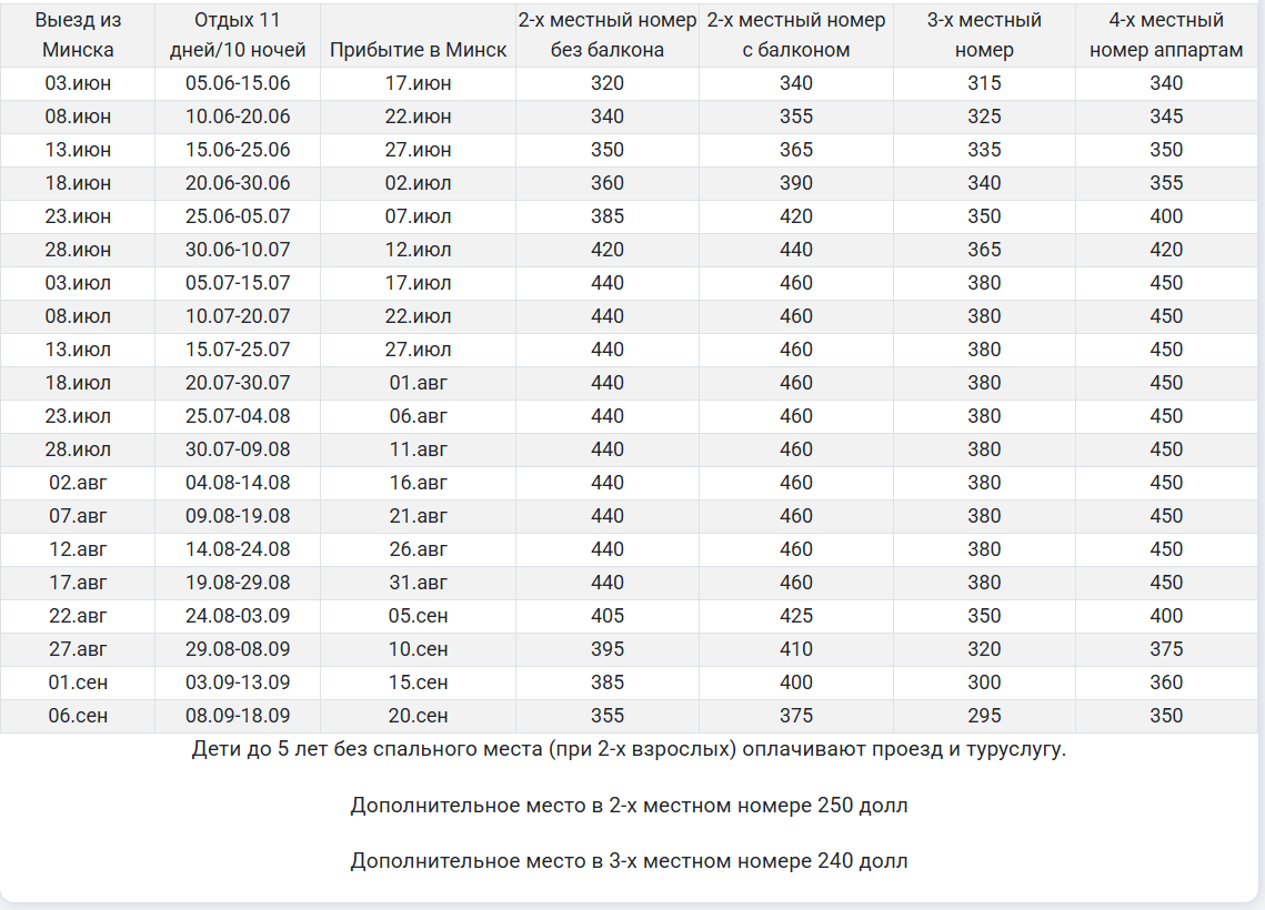 - комплекс туристических услуг: 150 BYN для взрослых, 90 BYN дет. до 11,99 лет (ИЮНЬ), 190 BYN для взрослых, 120 BYN дет. до 11,99 лет (ИЮЛЬ, АВГУСТ, СЕНТЯБРЬ)