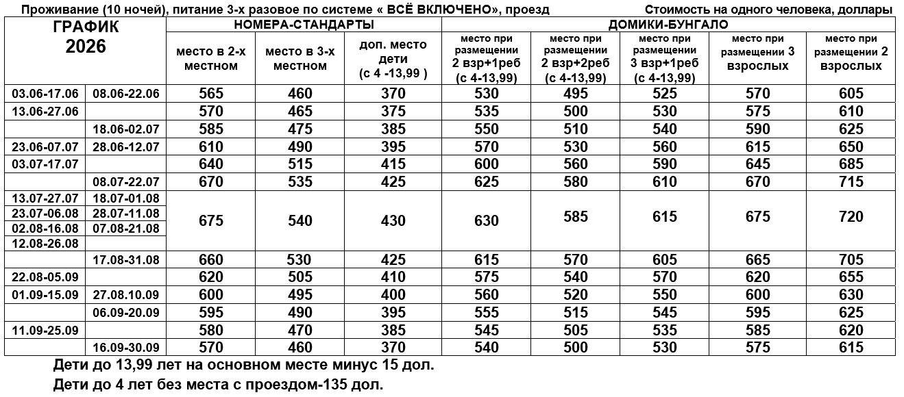 Проживание: в однокомнатных 1-о, 2-х, 2-х расширенных и 3-х местных номерах, а также двухкомнатных 4-х местных со всеми удобствами (душ, умывальник, туалет), телевизор, холодильник, кондиционер, балкон. Есть и номер Апартамент с оборудованной кухней. 2-х местные расширенные и 3-х местные номера имеют одну двуспальную кровать и раскладной диван. 1-о и 2-х местные номера одну двуспальную кровать, а двухкомнатный 4-х местный номер - двуспальную кровать и раскладной диван во второй комнате.