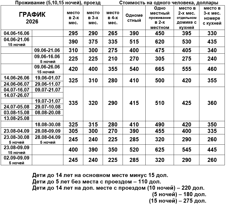 - комплекс туристических услуг: 150 BYN для взрослых, 90 BYN дет. до 11,99 лет (ИЮНЬ), 190 BYN для взрослых, 120 BYN дет. до 11,99 лет (ИЮЛЬ, АВГУСТ, СЕНТЯБРЬ)