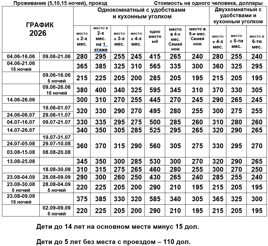 Проживание: В комфортабельных современных с добротной мебелью и электронными замками 2-х, 3-х и 4-х местных номерах, с удобствами (душ, туалет, умывальник), телевизором, кондиционером, холодильником и кухонным уголком с варочной панелью, электрочайником и необходимой посудой, сейфом.