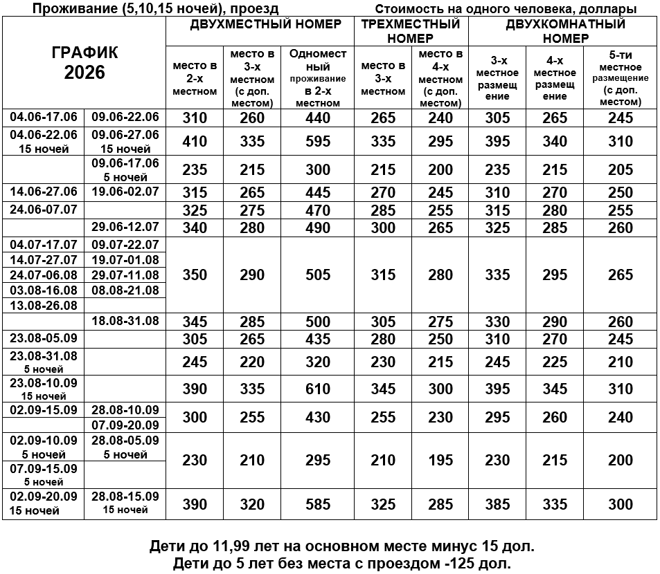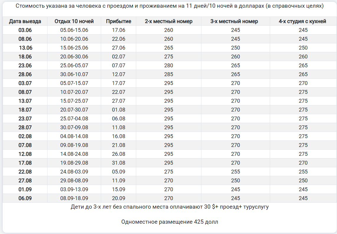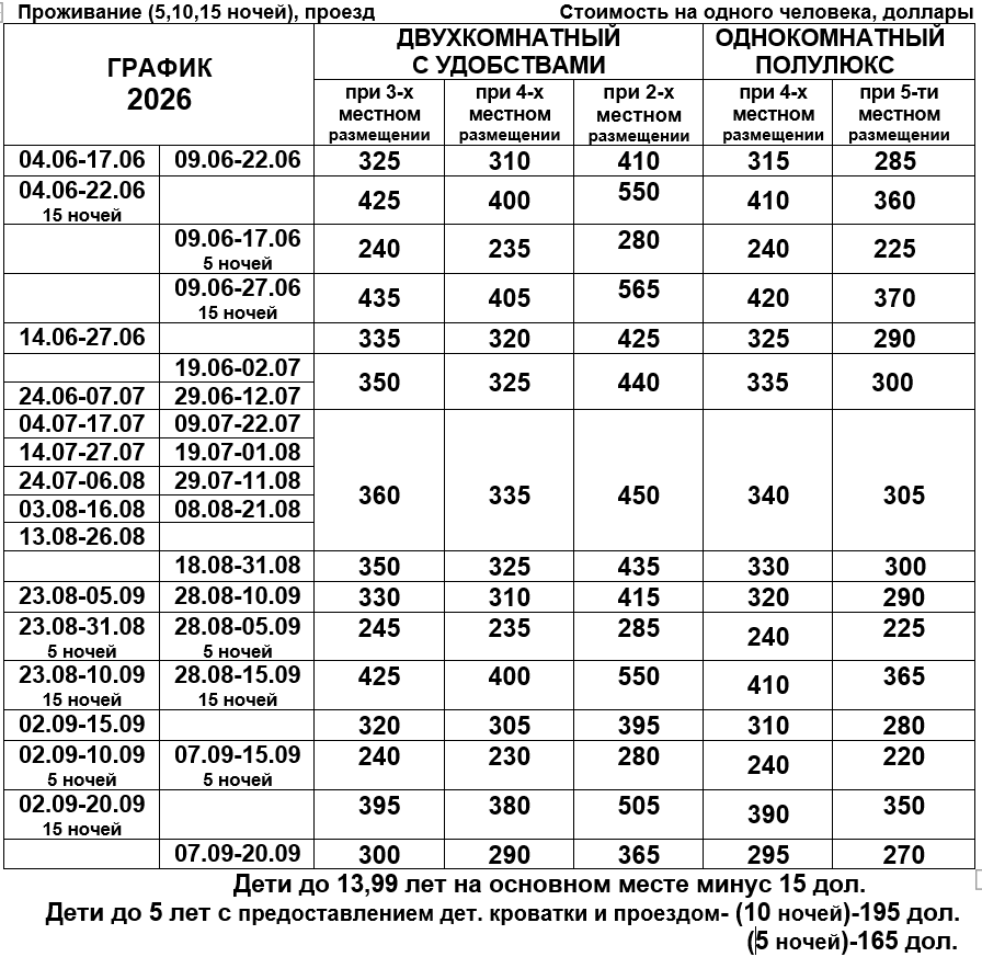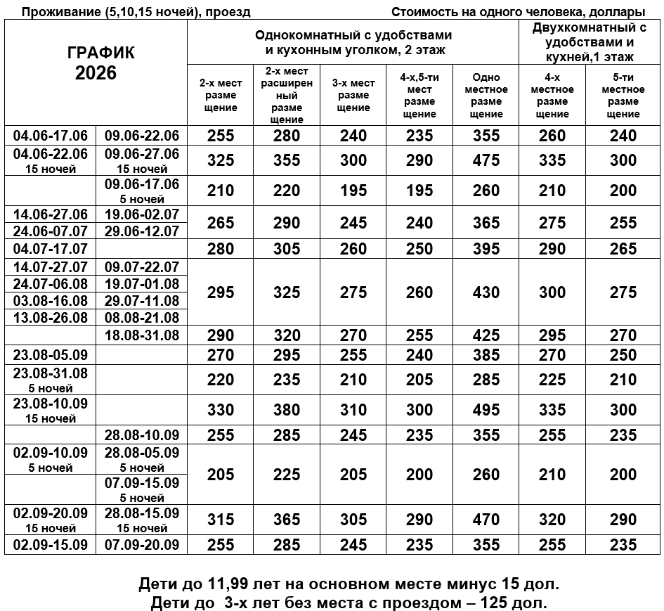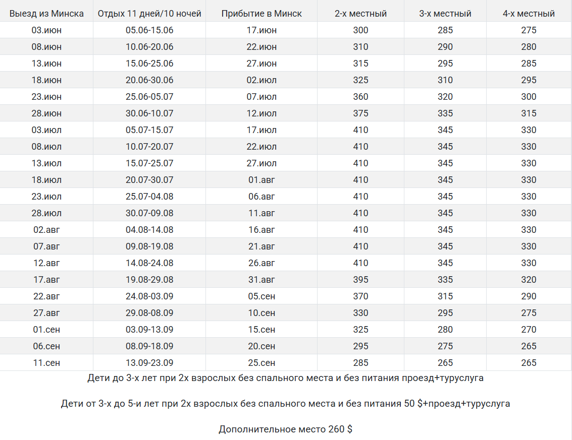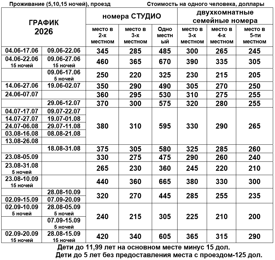 Дети до 5 лет без предоставления места, с проездом - минус 125$.