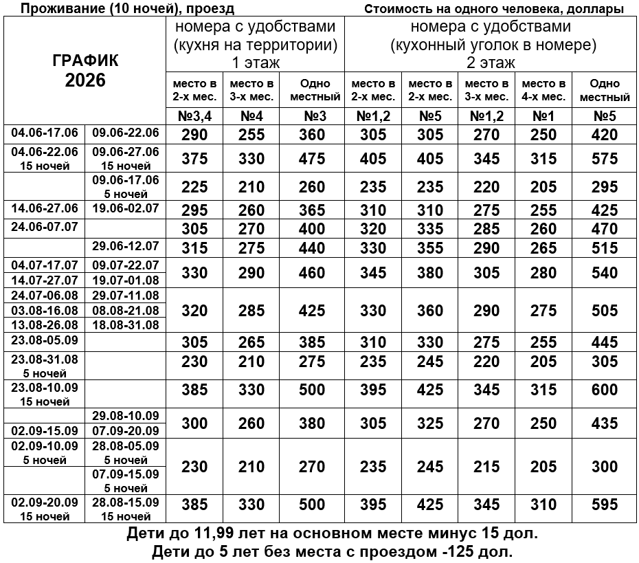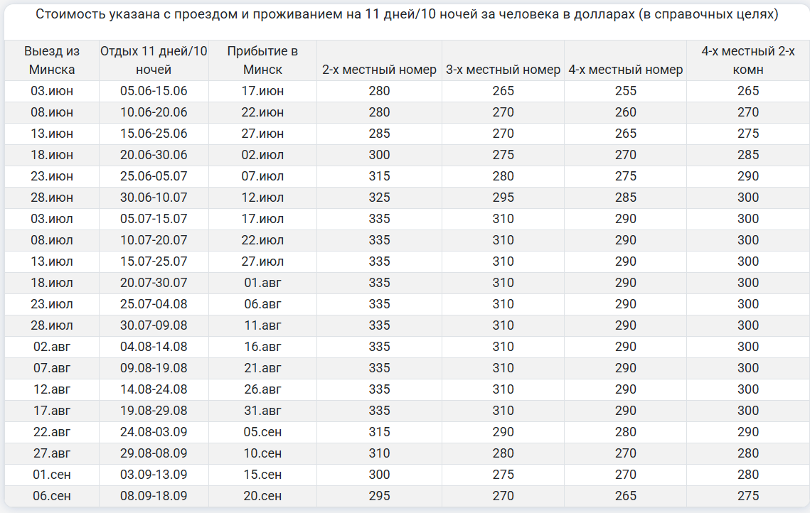 - комплекс туристических услуг: 150 BYN для взрослых, 90 BYN дет. до 11,99 лет (ИЮНЬ), 190 BYN для взрослых, 120 BYN дет. до 11,99 лет (ИЮЛЬ, АВГУСТ, СЕНТЯБРЬ)