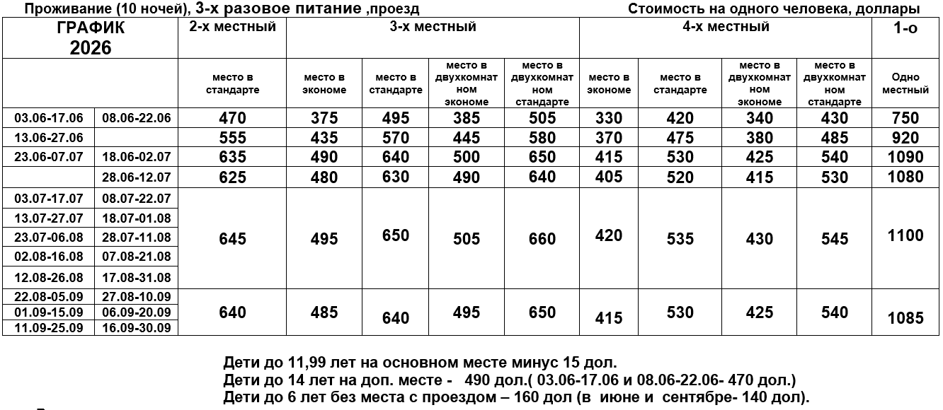 - комплекс туристических услуг: 150 BYN для взрослых, 90 BYN дет. до 11,99 лет (ИЮНЬ), 190 BYN для взрослых, 120 BYN дет. до 11,99 лет (ИЮЛЬ, АВГУСТ, СЕНТЯБРЬ)