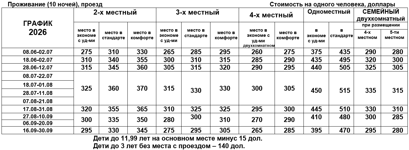 - комплекс туристических услуг: 150 BYN для взрослых, 90 BYN дет. до 11,99 лет (ИЮНЬ), 190 BYN для взрослых, 120 BYN дет. до 11,99 лет (ИЮЛЬ, АВГУСТ, СЕНТЯБРЬ)
