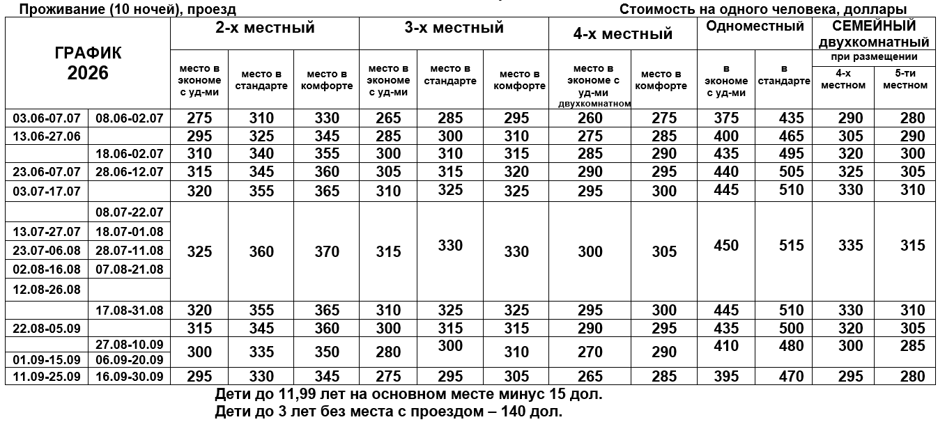 - комплекс туристических услуг: 150 BYN для взрослых, 90 BYN дет. до 11,99 лет (ИЮНЬ), 190 BYN для взрослых, 120 BYN дет. до 11,99 лет (ИЮЛЬ, АВГУСТ, СЕНТЯБРЬ)