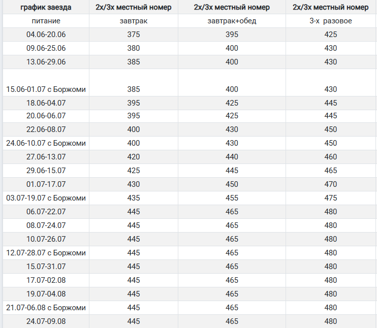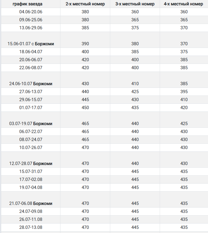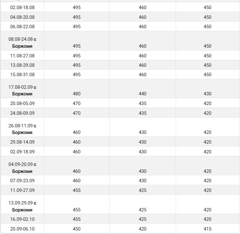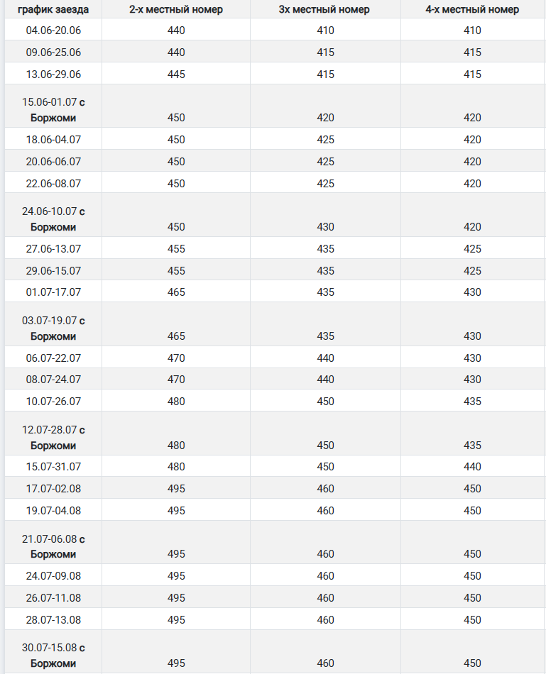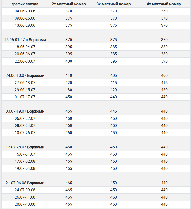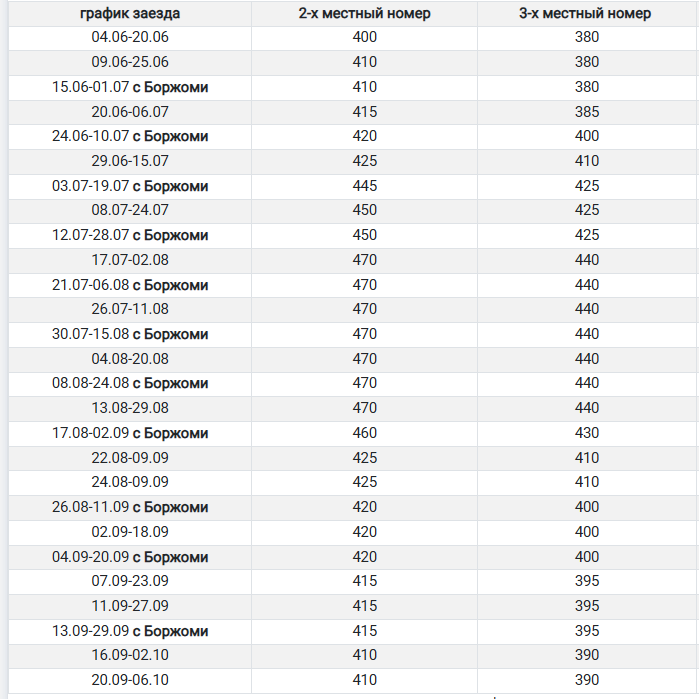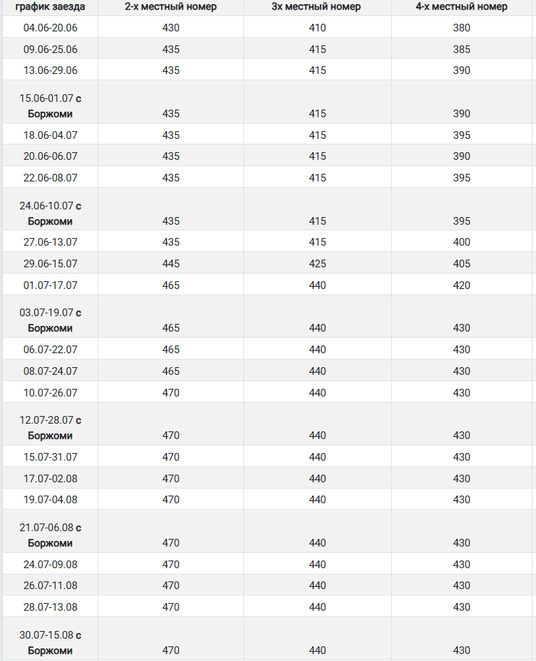 - посещение Боржоми на даты: 15.06, 24.06, 03.07, 12.07, 21.07, 30.07, 08.08, 17.08, 26.08, 04.09, 13.09