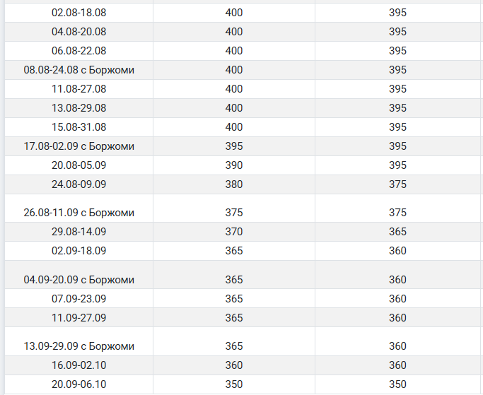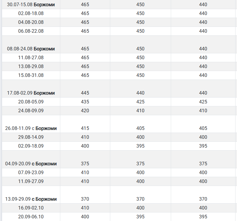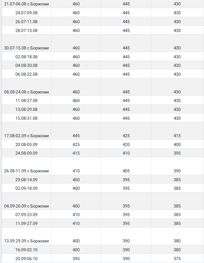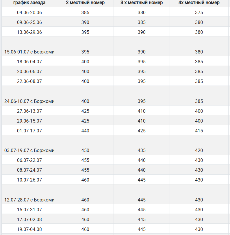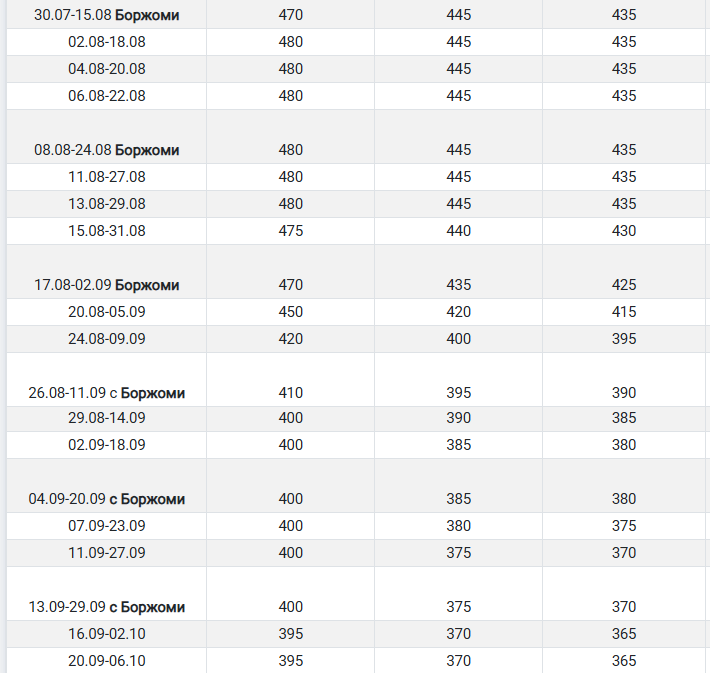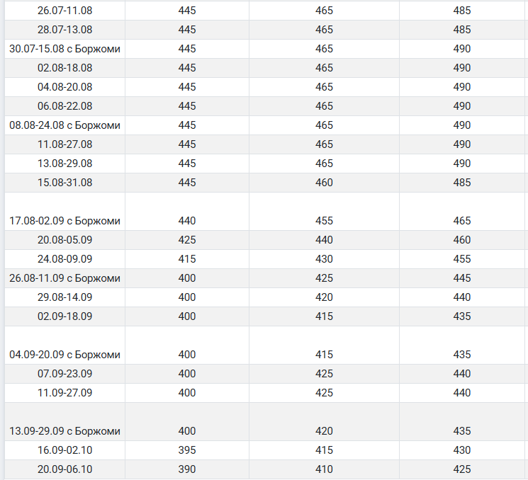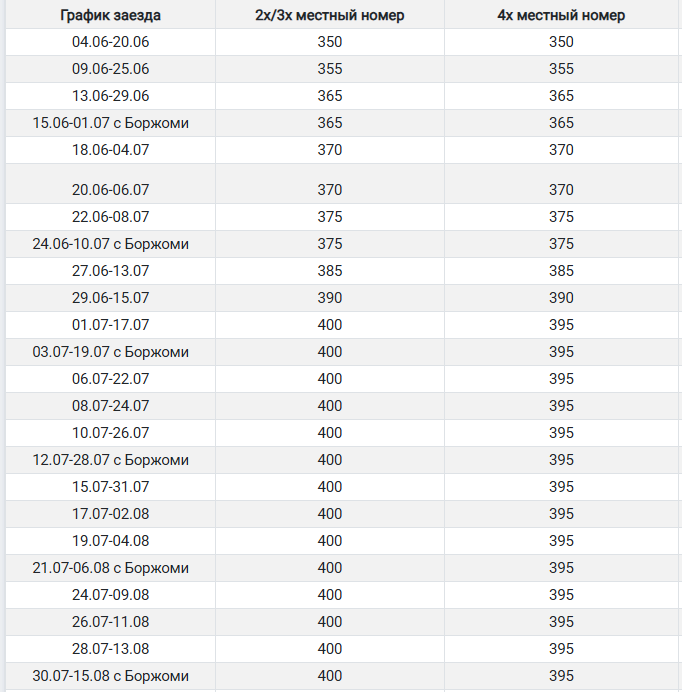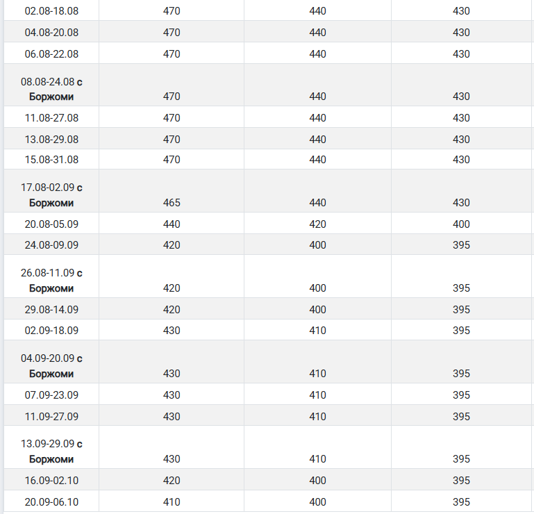 - посещение Боржоми на даты: 15.06, 24.06, 03.07, 12.07, 21.07, 30.07, 08.08, 17.08, 26.08, 04.09, 13.09