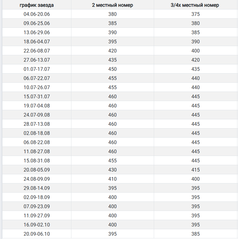 - питание на выбор (завтраки / 2ух разовое / 3х разовое / без питания)