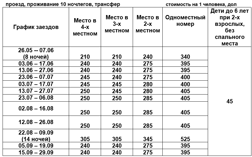 - проживание 10 ночлегов