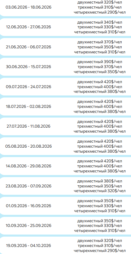 03.06, 12.06, 21.06, 30.06, 09.07, 18.07, 27.07, 05.08, 14.08, 23.08, 01.09, 10.09, 19.09.2026 г.Длительность: