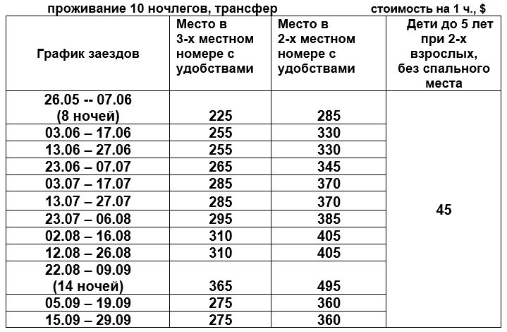 | Выезд из Минска | Отдых 10 ночей | Прибытие в Минск | 2х мест. н. | 3х мест. н. | 4х мест. н. | ребенок без места до 5 л |