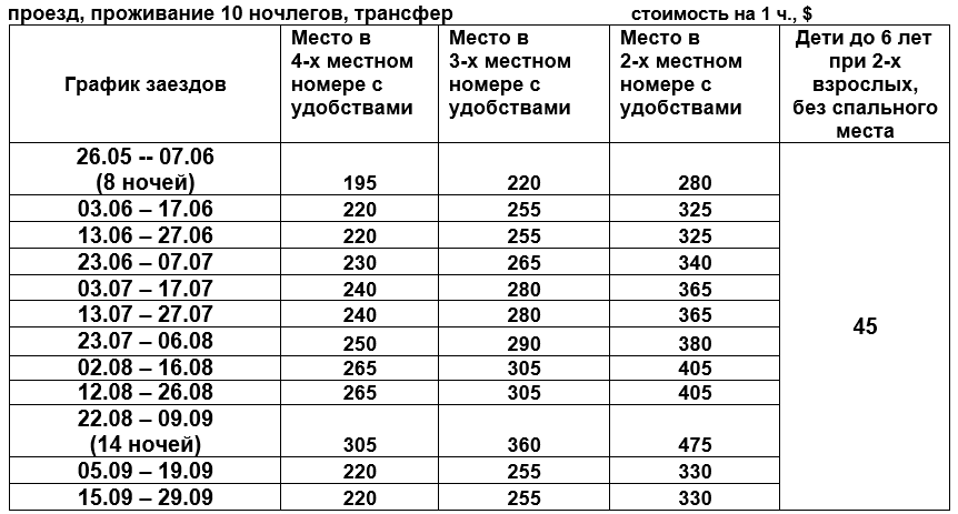 проезд, проживание 10 ночлегов, стоимость $ на 1 человека