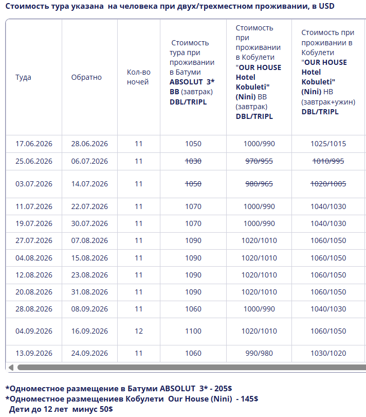 - завтраки в гостиницах Батуми, Кобулети (возможен завтрак + ужин)