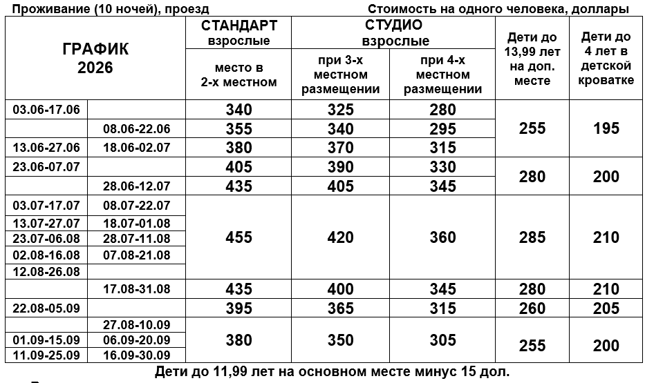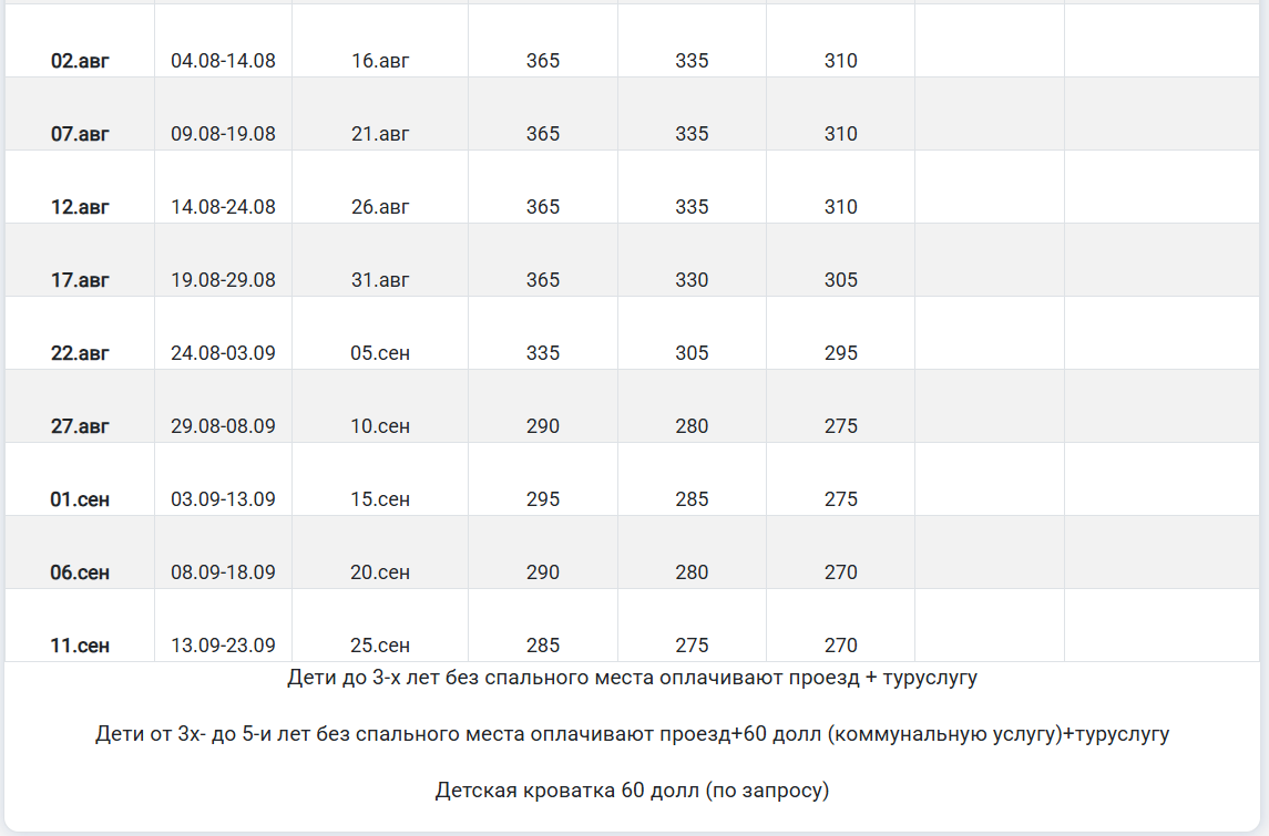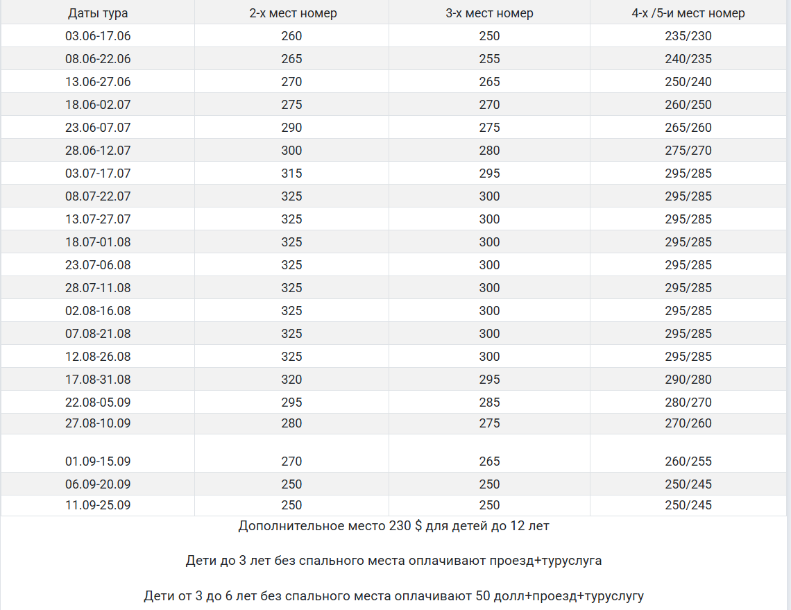 Дети до 3х лет при двух взрослых оплачивают проезд 140$ + транспортно-туристическую услугу 100 рублей.