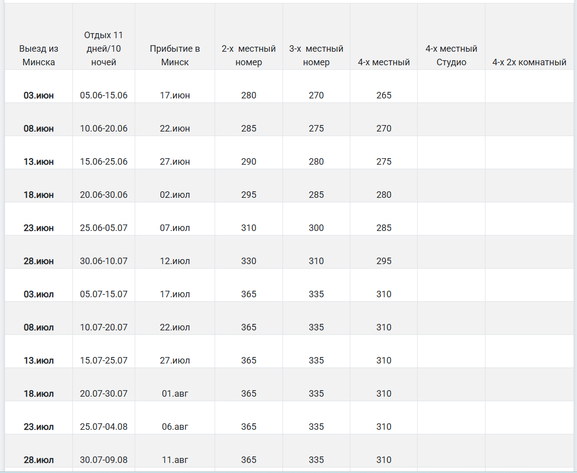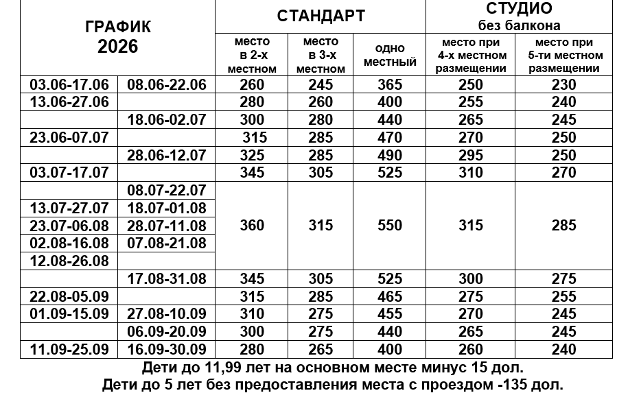- комплекс туристических услуг: 150 BYN для взрослых, 90 BYN дет. до 11,99 лет (ИЮНЬ), 190 BYN для взрослых, 120 BYN дет. до 11,99 лет (ИЮЛЬ, АВГУСТ, СЕНТЯБРЬ)