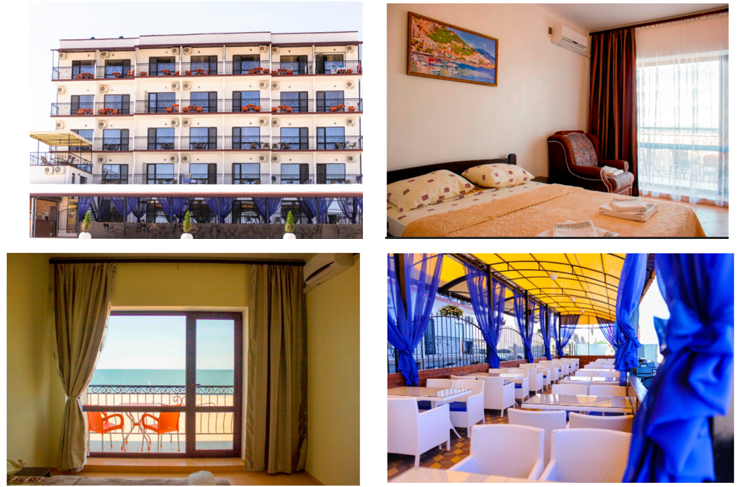 Новый отель, построенный в 2016г., находится в районе ст. Лиманская и расположен непосредственно на самом берегу моря. Все 35 номеров пятиэтажного корпуса имеют балкон и прямой вид на море.